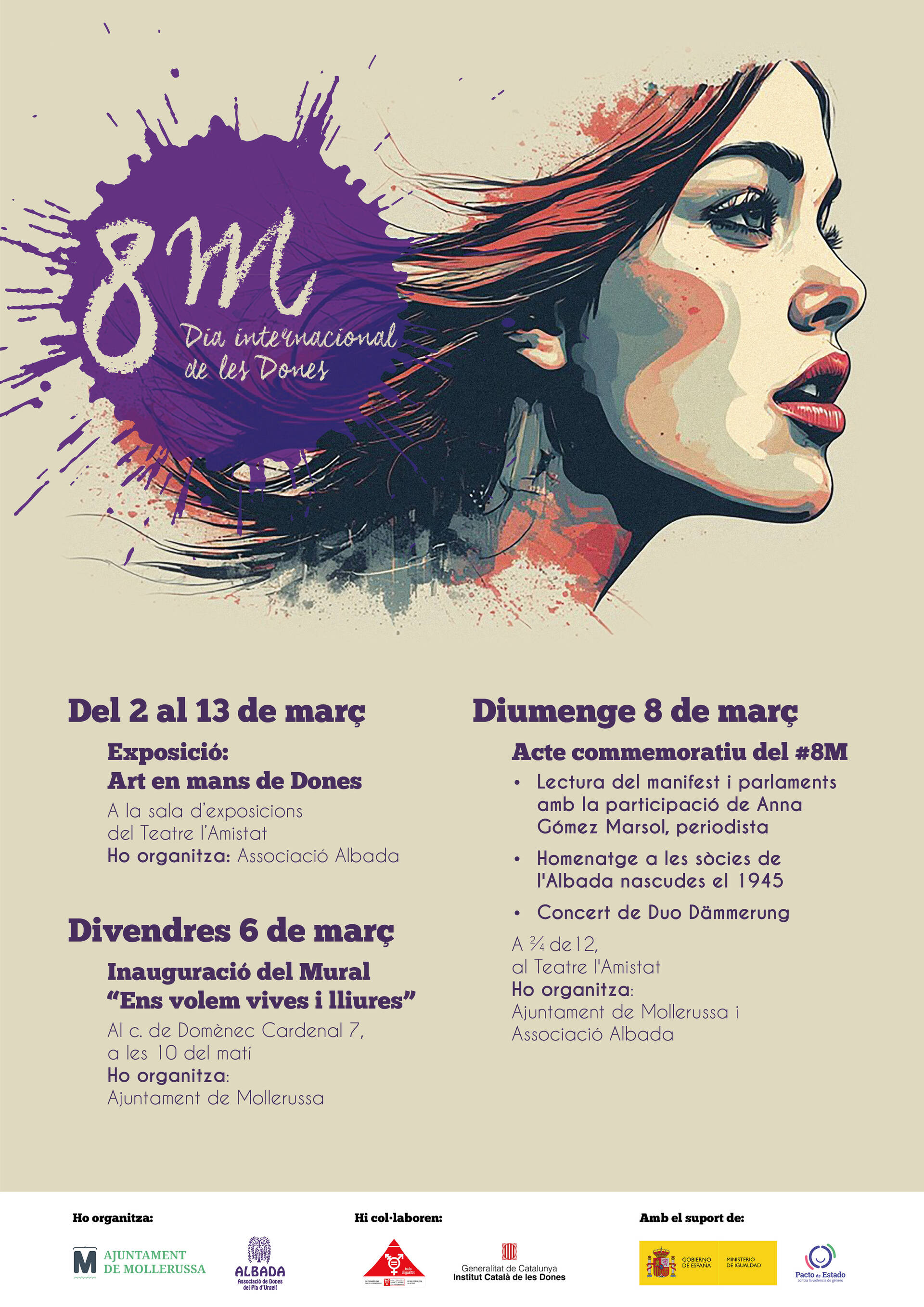 Mollerussa se suma un any més a la commemoració del Dia Internacional de les Dones amb un programa d’activitats que té com a objectiu fer valdre la lluita per la igualtat de gènere i donar visibilitat al paper de la dona en la societat. Per aquest motiu, l’Ajuntament promou la creació d’un mural commemoratiu al carrer de Domènec Cardenal sota el lema Ens volem vives i lliures, una obra que com la que es va inaugurar l’any passat portarà la signatura de la reconeguda muralista lleidatana Txus Montejano.
