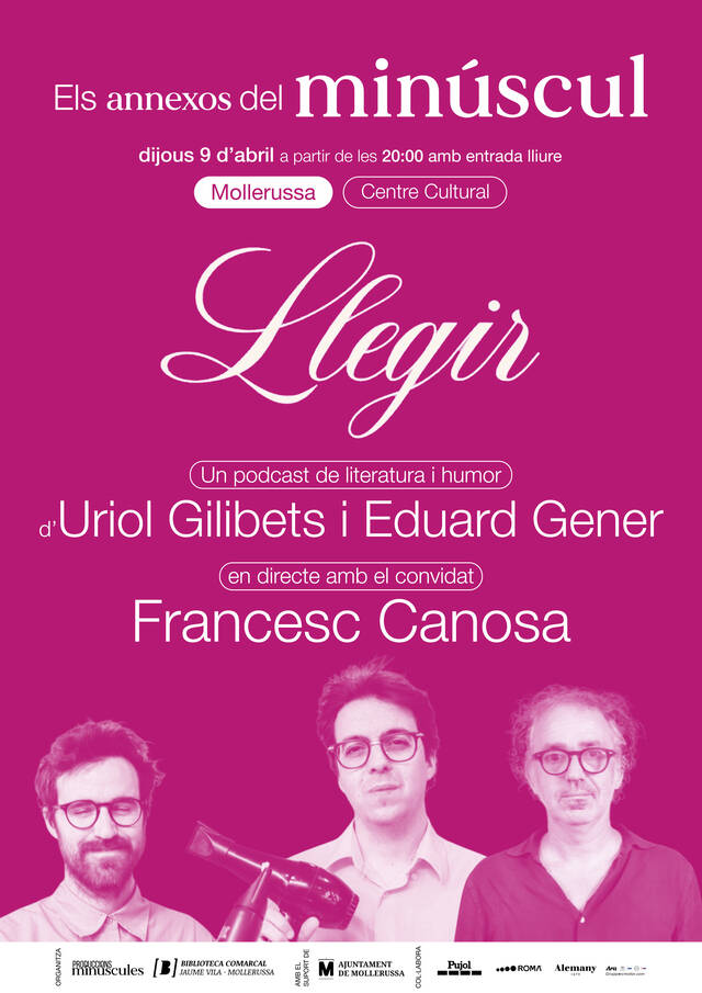 El cicle 'Els annexos del Minúscul', impulsat pel Festival Minúscul de Mollerussa, acollirà aquest dijous 9 d'abril una sessió en directe del podcast de literatura i humor Llegir, conduït per l'escriptor Uriol Gilibets i el músic Eduard Gener. Serà a les vuit del vespre al Centre Cultural, coorganitzat amb la Biblioteca Comarcal Jaume Vila i dins de la programació de les Festes de Sant Isidori.